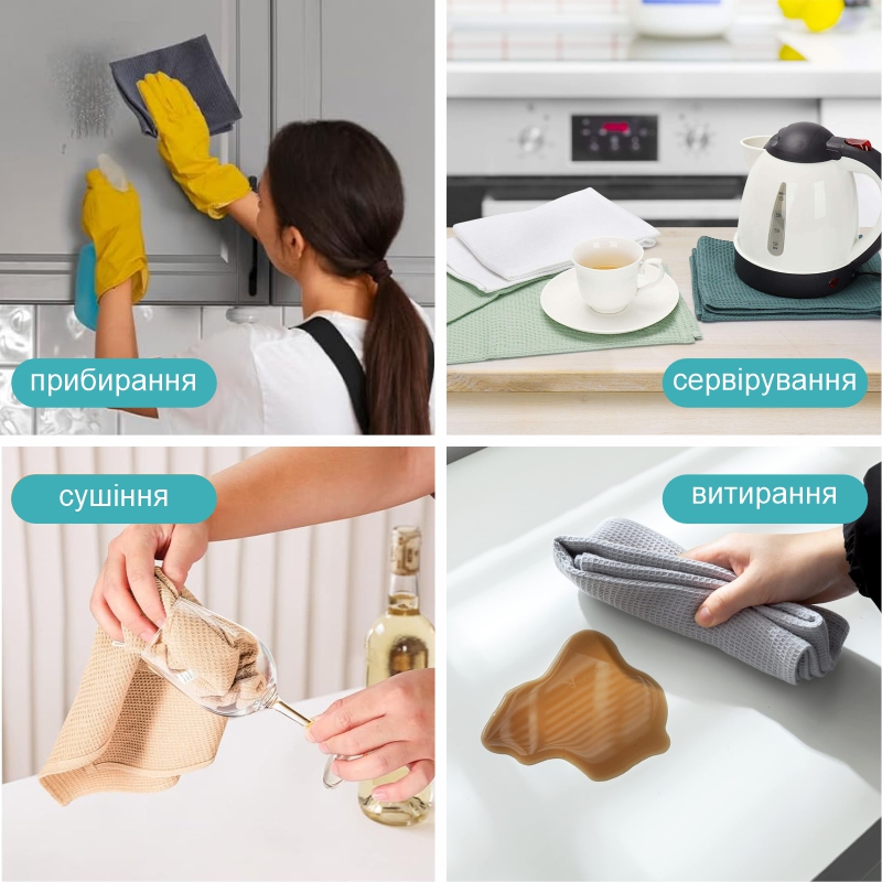 - Багатоцільове призначення: чудово підходить для сушіння посуду, чищення кухонних стільниць, витирання розлитих речовин, витирання рук, фруктів, овочів, миття плитки. Не залишає розводів, ворсинок та подряпин. Під час застілля, запропонуйте вашим гостям покласти іх на коліна або витерти руки.