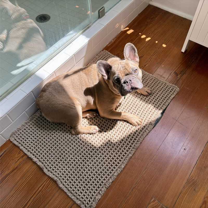 - Супермягкий и впитывающий – изготовлен из микрофибры, плотность 1000 г/м2, вес 400 грамм. Вафельный коврик для ванной очень мягкий, крепкий и быстро поглощает воду.